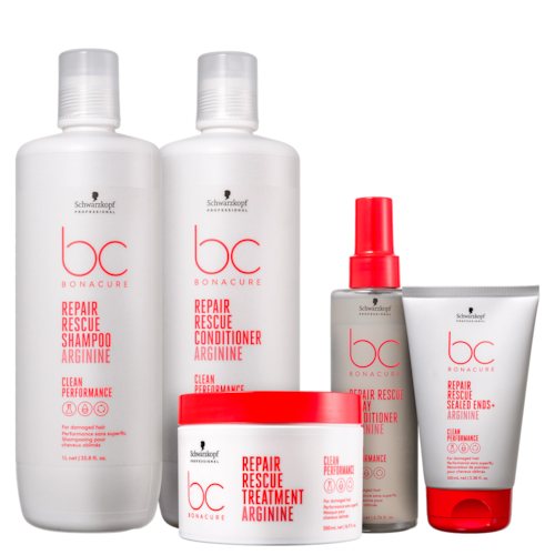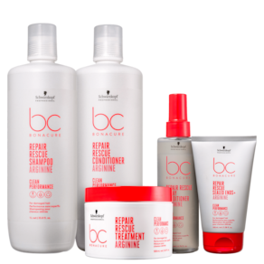 Kit de tratamento completo para cabelos danificados em tamanho profissional. Schwarzkopf Professional BC Bonacure Clean Performance Repair Rescue Pro Quinteto recupera força e elasticidade internas sem sobrecarga dos fios.