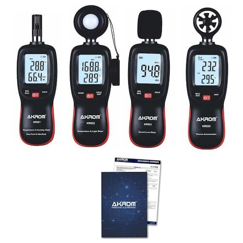 Kit Segurança Do Trabalho Com Certificado De Calibração Akrom Kit segurança do trabalho akrom kr921 / kr922 / kr923 / kr925 +Certificados de calibração rastreável rbc/inmetroKr921 - medidor de temperatura e umidade com indicação De ponto de orvalho e bulbo úmidoEspecificações técnicasTemperatura: Faixa de medição: -20 a 70c Resolução: 0.1c Exatidão: +/- 1cUmidade relativa: Faixa de medição: 0 a 100%ur Resolução: 0.1%ur Exatidão: +/- 4%urPonto de orvalho dew point : Faixa de medição: -20 a 50c Resolução: 0.1c Exatidão: +/- 2cBulbo úmido wet bulb : Faixa de medição: -20 a 50c Resolução: 0.1c Exatidão: +/- 2cMemória interna: 1000 mediçõesIntervalo entre registros: 10sAlarme de alta hi : 35c / 80%ur não configurável Alarme de baixa lo : 10c / 10%ur não configurável Temperatura de operação: -20 a 70cUmidade de operação: 0 a 100%ur sem condensação Alimentação: 4.5v 3 pilhas aaa Dimensões l x a x p : 56 x 184 x 36 mmPeso: 100 gKr922 - termo-luxímetro digitalEspecificações técnicasIluminamento: Faixa de medição: 0 a 200k lux 0 a 20k fc Resolução: 0.1 lux 0 a 199.9 lux 1 lux 200 a 1999 lux 10 lux 2000 a 19990 lux 100 lux 20000 a 200000 lux Exatidão: +/- 3% 0 a 10k lux / +/- 4% acima de 10k lux Temperatura: Faixa de medição: -10 a 50c Resolução: 0.1c Exatidão: +/- 1cMemória interna: Gravação automática: 1000 medições Gravação manual: 67 mediçõesIntervalo entre registros gravação automática : 10sTipo de sensor: fotodiodo de silícioTemperatura de operação: -10 a 50cUmidade de operação: 10 a 90%ur sem condensação Alimentação: 4.5v 3 pilhas aaa Dimensões l x a x p : 56 x 194 x 36 mmPeso: 130 gKr923 - decibelímetro digitalEspecificações técnicasFaixa de medição: 30 a 130 dbaResolução: 0.1 dbExatidão: +/- 1.5 dbFaixa de frequência: 31.5 hz a 8 khzPonderação em frequência: aClasse: 2Temperatura de operação: 0 a 40cUmidade de operação: 10 a 80%ur sem condensação Alimentação: 4.5v 3 pilhas aaa Dimensões l x a x p : 56 x 117 x 36 mmPeso: 100 gKr925 - termo-anemômetro digitalEspecificações técnicasVelocidade do vento: Faixa de medição: 0 a 30 m/s Resolução: 0.1 m/s Exatidão: +/- 5%Temperatura do ar: Faixa de medição: -10 a 45c Resolução: 0.1c Exatidão: +/- 2cMemória interna: 999 grupos de dadosIntervalo entre registros: 10s não configurável Temperatura de operação: -10 a 50cUmidade de operação: 0 a 90%ur sem condensação Alimentação: 4.5v 3 pilhas aaa Dimensões l x a x p : 56 x 188 x 36 mmPeso: 110 g