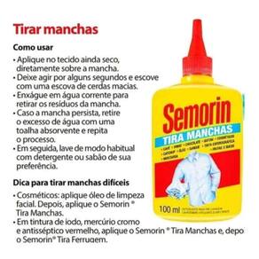 - cosméticos: aplicar óleo de limpeza facial, a seguir, aplicar o tira manchas. - tintura de iodo, mercúrio cromo, anti-séptico vermelho: aplicar semorin tira manchas e depois semorin tira ferrugem.