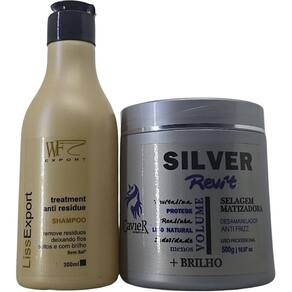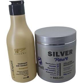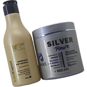 Shampoo 300ml liss export anti residuo wf cosméticos Ideal para cabelos opacos que sofrem com fios indisciplinados e frizz , entrega um verdadeiro resultado de salão para a sua rotina. A linha liss export anti residuo ou de limpeza profunda é projetada para remover o acúmulo de resíduos, produtos para cabelo e impurezas que se acumulam no cabelo e no couro cabeludo ao longo do tempo. Ele difere dos shampoos comuns, pois possui uma fórmula mais potente. Foi desenvolvida com extrato glicólico de pelve tia canaliculada, extrato de cacau, seriseal proteína de soja que somados, hidratam, dão emoliência, intensificam o brilho natural e a cor dos cabelos. Reestruturam principalmente cabelos danificados, quebradiços e quimicamente tratados. Modo de uso: Aplique o shampoo sobre os cabelos molhados, massageando o couro cabeludo e os fios com as pontas dos dedos até obter uma espuma abundante. Enxágue. Repetir a aplicação. Enxágue bem e aplique os outros produtos da linha. ==== Selante silver Reduz o volume dos fios e acentua o loiro, deixando matizado e com mais brilho, composto por aminoácidos, vitaminas, queratina hidrolisada e acid violet 43 que além de alisar, tratam os cabelos, deixando-os com um liso natural, macios, com muito brilho e hidratados. Realinha, protege, revitaliza, a máscara selante capilar silver revit cavier é um tratamento para recuperar as massas capilares danificadas, selando as escamas do cabelo loiro, acabando com o frizz e reduzindo o volume. O tratamento age deixando os cabelos macios, emolientes, com brilho e hidratados, sendo sua aplicação rápida e mais eficiente que qualquer hidratação. Reduz o volume, realinha os fios e acentua o loiro. Modo de usar: após lavar os cabelos com anti resíduos, retire o excesso de água com o auxílio de uma toalha e aplique a máscara selante capilar silver revit cavier nos cabelos úmidos, deixar agir por 10 minutos e proceder com a técnica convencional de escovação e chapa opcional . Enxague em seguida.