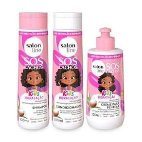 Contém: 01 - Shampoo Kids S.O.S Cachos Hidratação e Desembaraço Salon Line 300ml 01 - Condicionador Kids S.O.S Cachos Hidratação e Desembaraço Salon Line 300ml 01 - Creme para Pentear S.O.S Cachos Hidratação Definição Kids Salon Line 300ml