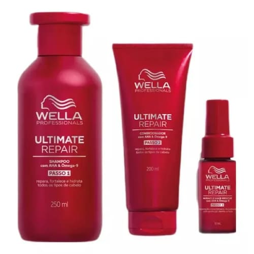 Wella Ultimate Repair - Shampoo 250ml: possui uma fórmula rica, cremosa e sem peso com uma textura agradável e fragrância luxuosa. Garante reparação com tecnologia patenteada, combinando o poder do AHA e do Ômega-9, poderosos ativos para os fios.