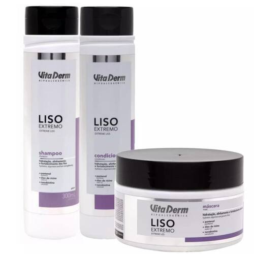 Kit Vita Derm Liso Extremo 3 Produtos Kit para cabelos lisos naturais, com frizz e que passaram por procedimentos de alisamento, progressiva e redução de volume. vita Derm Liso Extremo traz produtos que promovem efeito liso prolongado e eliminam o frizz.