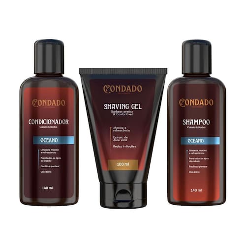 Kit Condado Oceano - Shampoo + Condicionador + Gel de Barbear 140ml ProfissionalO Kit Condado Oceano é ideal para homens que valorizam praticidade, cuidado e frescor no dia a dia. Composto por Shampoo, Condicionador e Gel de Barbear, garante cabelos e barba sempre bem cuidados, além de um barbear confortável e sem irritações.
