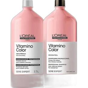 As fórmulas do Kit LOréal Professionnel Vitamino Color Resveratrol Duo contam com o poderoso antioxidante resveratrol, que combate os radicais livres responsáveis pelo desbotamento da cor. Ainda sela as cutículas para evitar a perda de pigmento, garantir toque macio e adicionar brilho.