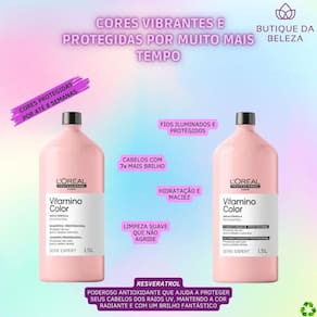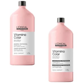 Kit Shampoo E Condicionador Loreal Vitamino Color 1,5L Este kit contém 01 shampoo loreal vitamino color resveratrol 01 condicionador loreal vitamino color resveratrol Ativos - resveratrol Poderoso antioxidante extraído da casca da uva, ajuda a proteger os cabelos contra os radicais livres, e os raios uv, responsáveis pela degradação da cor. Indicado - cabelos com coloração. - cabelos com mechas. - cabelos danificados. - cabelos desbotados. - cabelos secos. - cabelos ressecados. - cabelos opacos. - cabelos desidratados. - cabelos frágeis. - todos os tipos de cabelos Benefícios - limpeza suave. - manutenção da cor. - brilho. - preservação da cor. - cores vibrantes. - proteção uv. - proteção antioxidante. - restauração. - hidratação. - maciez. - restauração. Shampoo loréal professionnel vitamino color resveratrol Shampoo loreal vitamino color, feito para cabelos coloridos, com uma fórmula que limpa suavemente sem agredir os fios, é o primeiro passo para deixar seus cabelos com as cores vibrantes e protegidas por muito mais tempo. O shampoo vitamino color resveratrol conta com fórmula antioxidante que evita os danos do dia a dia e o desbotamento. Enriquecido com resveratrol, ajuda a restaurar e proteger contra os radicais livres, agentes oxidantes e os raios uv, responsáveis pela degradação da cor. Condicionador loréal professionnel vitamino color resveratrol Condicionador de tratamento para cabelos coloridos. Promove proteção e manutenção da cor, deixando seus cabelos hidratados e iluminados. O condicionador vitamino color resveratrol tem fórmula com um poderoso antioxidante que protege contra os radicais livres e agentes oxidantes que agridem e desbotam a cor. O resultado é um cabelo macio e hidratado, com 8 semanas de proteção da cor e com 7x mais brilho. Modo de uso - shampoo Com os cabelos molhados, aplique uma pequena quantidade no couro cabeludo e massageie até surgir espuma. Enxágue. - condicionador Com os cabelos lavado e úmido, aplique no comprimento e pontas. Deixe agir por alguns instantes. Enxágue bem. Dica butique da beleza Para melhores resultados, use a linha completa vitamino color, de loréal. Marca: Não Informado Ean: 7893692915393