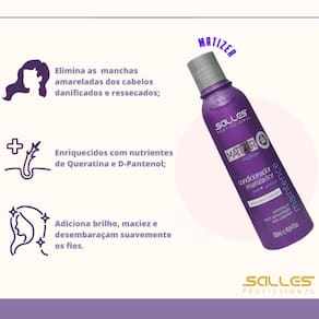 O Kit Matizer Maintence da Salles Profissional inclui Shampoo e Condicionador de 300 ml cada, ideais para manter cabelos loiros, descoloridos, com mechas ou grisalhos livres de amarelamento. Com ativos matizadores e nutritivos, essa dupla neutraliza tons indesejados, hidrata profundamente os fios e entrega loiros luminosos, resistentes e saudáveis.
