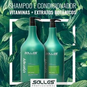 O Shampoo THERAPY Capilar - Salles Foi criado para ser em todos os tipos de cabelo limpa os fios proporcionando-lhes brilho, vitalidade e aparência saudável. Refrescância ao couro cabeludo. Contém: Vitaminas e Extratos Botânicos Passo a Passo: Aplicar o Shampoo THERAPY Capilar Salles sobre os cabelos molhados massageando-os bem. Enxaguar e repetir a operação. Utilizar regularmente com o condicionador THERAPY Capilar Salles para completar a manutenção de tratamento cosmético capilar. Indicação: Para raízes oleosas. Efeito: Cabelos brilhantes e com vitalidade. Condicionador THERAPY Capilar - Salles Possui em sua formula agentes condicionantes que amaciam e desembaraçam os fios com facilidade. Promove brilho e maciez sendo ideal para os enxagues. Logo após finalize como desejar. Contém: Vitaminas e Extratos Botânicos Passo a Passo: Aplicar o Shampoo THERAPY Capilar Salles sobre os cabelos molhados massageando-os bem. Enxaguar e repetir a operação. Utilizar regularmente com o condicionador THERAPY Capilar Salles para completar a manutenção de tratamento cosmético capilar. Indicação: Para raízes oleosas. Efeito: Cabelos brilhantes e com vitalidade. Marca: Não Informado Ean: 7898700162264