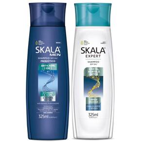 O kit é composto por: 1 Shampoo Skala Anticaspa Men 325ml 1 Shampoo Skala Detox Cristal Hortelã 325ml
