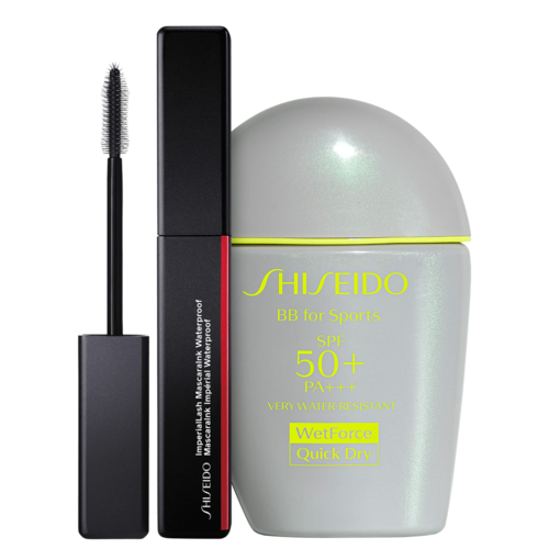Kit com base com protetor solar e máscara para cílios à prova d’água. Shiseido ImperialLash BB For Sports uniformiza o tom da pele e protege, além de destacar o olhar e ser recomendada para quem pratica esportes ao ar livre.