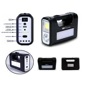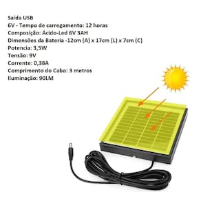 Saída USB – Carrega celular, tablet, lanterna; Acompanha 3 lâmpadas Led de 3w; Carregamento na tomada ou painel Solar (possui lanterna e luz de emergência); Led indicativo que está carregando; Entrada de Carregamento tomada 110-220v; 4 Saídas para lâmpadas de Led 6V – Tempo de carregamento: 12 horas; Composição: Ácido-Led 6V 3AH; Dimensões da Bateria -12cm (A) x 17cm (L) x 7cm (C); Potencia: 3,5W; Tensão: 9V; Corrente: 0,38A; Comprimento do Cabo: 3 metros; Iluminação: 90LM; Comprimento do cabo: 4 metros;Itens Inclusos: