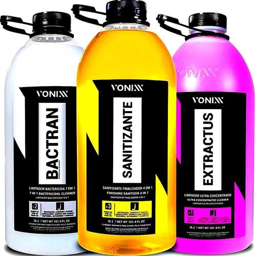 Kit sistema vsc bactran, extractus e sanitizante 3l vonixx Kit sistema vsc vonixx smart cleaning extractus,sanitizante ebactran3l vonixx Extractus limpador ultra concentrado 3l - vonixx Extractus é um limpador ultra concentrado de alta performancee baixa espumação, desenvolvido para limpeza de estofados, carpetes e tapetes. Seu uso é indicado em extratoras. Sua fórmula contém tensoativos e alcalinizantes especiais que removem facilmente os mais diversos tipos de sujeira, em especial as derivadas de graxa, suor e gorduras em geral. Diluições Sujeira pesada 1:10 Sujeira média 1:30 Sujeira leve 1:60 A diluição poderá ser alterada para mais ou para menos a depender do resultado observado. Observação:recomendamos spot test para verificar a compatibilidade do produto com a superfície. Modo de uso: Diluir o produto na proporção ideal de acordo com o nível de sujeira. Pulverizar uma fina névoa de produto, mantendo distância entre 20cm a 30cm da superfície, a fim de evitar encharcamento do estofado ou carpete. Aguardar 2 minutos Utilizar escova macia e realizar a esfregação para auxiliar no desprendimento da sujeira Realizar a extração ou aspiração sem enxague Realizar uma segunda extração com enxague Sanitizante finalizador 4 em 1 3l - vonixx Sanitizante finalizador é um produto 4x1, desenvolvido exclusivamente para ser aplicado sob forma de pulverização na última etapa da limpeza de estofados, carpetes e tapetes. Sua fórmula mata germes, bactérias e deixa um ativo residual com efeito bacteriostático, diminuindo as chances de crescimento de germes por até três meses. O produto promove agradável aroma na superfície e toque de maciez nas fibras. Modo de uso: Após limpar o estofado, aplicar uma fina névoa do sanitizante finalizador, diluído na proporção 1:10 e aguardar 10 minutos para o produto agir. Realizar a extração ou aspiração sem enxague a fim de deixar um residual do produto. Essa pequena quantidade de produto residual auxiliará na eliminação de bactérias que porventura não foram removidas, agindo também na prevenção do crescimento de bactérias. Diluição padrão:1:10 Bactran limpador bactericida 7 em 1 3l - vonixx Bactran é um limpador bactericida ultra concentrado de alta performance e baixa espumação, desenvolvido para limpeza de estofados, carpetes e tapetes. Seu uso é indicado com extratoras. Sua fórmula contém tensoativos especiais que agem em sinergia com o peróxido de hidrogênio e remove facilmente os mais diversos tipos de sujeira, em especial manchas de sangue, suco, café e bolores, além de eliminar fungos e bactérias. 7 em 1: Tira manchas; Limpa; Alveja; Neutraliza o ph; Desinfeta mata até 99,99% de bactérias; Neutraliza odores; Elimina fungos. Modo de uso: A depender do nível de sujeira, diluir o produto na proporção que está no campo de diluições. Pulverizar uma fina névoa do produto, mantendo distância entre 20cm a 30cm da superfície, a fim de evitar encharcamento do estofado ou carpete. Aguardar 5 minutos. Utilizar escova macia e realizar a esfregação para auxiliar no desprendimento da sujeira. Realizar a extração ou aspiração sem enxague. Realizar uma segunda extração, dessa vez com enxague. Diluições: Sujeira pesada: 1:10 Sujeira média: 1:30 Sujeira leve 1:60 A diluição poderá ser alterada para mais ou para menos a depender do resultado observado. Produto não inflamável.