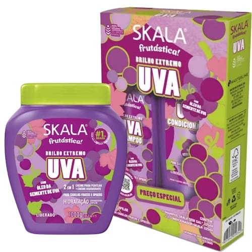 Shampoo UvaDermatologicamente testado.Para cabelos fracos e opacos.Experimente Skala Frutástica com o frescor da uva para um brilho deslumbrante em seus cabelos! O Óleo de semente de uva é rico em vitamina E, fortalecendo os fios e protegendo contra a queda. O D-pantenol e a Vitamina A dão força, hidratam e auxiliam na manutenção do comprimento saudável dos fios. E, para finalizar, desfrute do aroma irresistível da uva, proporcionando uma viagem sensorial única.Condicionador UvaSem parabenos, petrolato, silicones e óleo mineral.Dermatologicamente testado.Para cabelos fracos e opacos.Experimente Skala Frutástica com o frescor da uva para um brilho deslumbrante em seus cabelos! O Óleo de semente de uva é rico em vitamina E, fortalecendo os fios e protegendo contra a queda. O D-pantenol e a Vitamina A dão força, hidratam e auxiliam na manutenção do comprimento saudável dos fios. E, para finalizar, desfrute do aroma irresistível da uva, proporcionando uma viagem sensorial única.