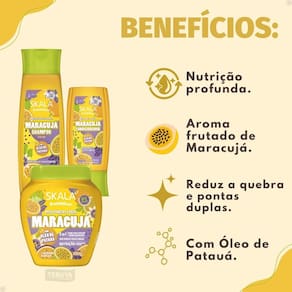 Kit Skala Maracujá: Shampoo 325ml, Condicionador 200ml e Máscara de Tratamento 1000g Descubra o poder da natureza com o Kit Skala Maracujá, uma solução completa para a nutrição capilar que atende a todos os tipos de cabelos. Este kit é a escolha perfeita para quem busca fios saudáveis, fortes e com um brilho intenso, sendo ideal para a etapa de nutrição do seu cronograma capilar.