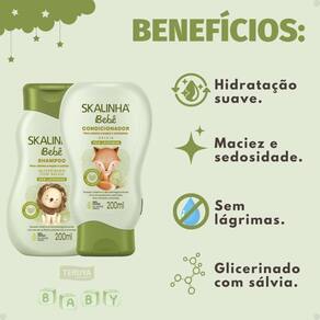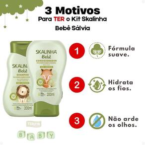 Condicionador: Para um melhor resultado e para desembaraçar os fios com facilidade, após o uso do shampoo, aplique o Condicionador Skalinha Bebê Sálvia nos cabelos molhados, do comprimento às pontas. Deixe agir por alguns instantes e enxágue completamente.