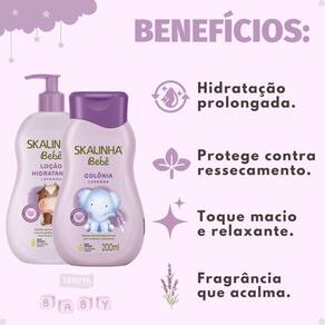 Kit Skalinha Bebê Lavanda: Loção Hidratante e Colônia 200ml Apresentamos o Kit Skalinha Bebê Lavanda da SKALA, a solução ideal para pais que buscam o cuidado mais delicado e relaxante para a pele de seus bebês. Este kit exclusivo combina hidratação profunda com a suave fragrância de lavanda, transformando a rotina de cuidados em um momento de puro carinho e bem-estar.