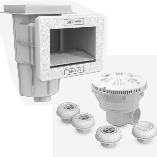 Acompanha: 1 skimer, 1 Dreno de Fundo, 1 Dispositivo de Aspiração, 2 Dispositivos de Retorno e 1 Dispositivo de Nivel ladrão / extravazador Material: ABS - branco Tubulação 1 1/2" ou 50mm Indicado para Piscinas em Vinil ou Alvenaria Marca: Sibrape Ean: 7899935931144
