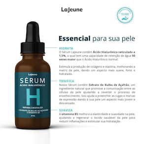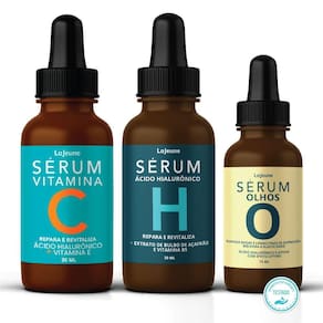 Kit skincare 3 sérum profissional - vitamina c antimarcas + ácido hialurônico antiidade + sérum olhos atenuador olheiras Kit lajeune rotina em 3 passos é o combo de 3 séruns perfeito para deixar sua pele radiante Kit composto por: 1 sérum vitamina c 30ml + 1 sérum ácido hialurônico 30ml + 1 sérum olhos 15ml 1 sérum facial vitamina c: repara clareia e revitaliza2 sérum facial ácido hialurônico: hidrata, suaviza e tonifica3 sérum olhos para a área dos olhos: reduz rugas, atenua olheiras, melhora a elasticidade ademais de ser a textura ideal pre-maquiagem Sérum vitamina c:O envelhecimento e a exposição solar são fatores que afetam a nossa pele que precisa de vitaminas. O sérum de vitamina c lajeune contém nutrientes essenciais para estimular a produção de colágeno, revitalizar e rejuvenescer. Prevenção e redução das rugas e linhas de expressão. Elimina pequenas manchas. Aumenta a elasticidade e o tônus da pele. Um tratamento facial para uso diário, recomendado para todos os tipos de pele, sem deixar seu rosto oleoso Sérum ácido hialurônico:O sérum lajeune contém ácido hialurônico reticulado, o qual tem uma capacidade de retenção de água 50 vezes maior que o ácido hialurônico normal. Estimula a produção de colágeno e elastina, melhorando a matriz da pele, criando um aspecto mais suave, forte e hidratado. Além disso, contém ingredientes naturais que ajudam a reverter o processo de envelhecimento, dando à sua pele um aspecto mais jovem e descansado. Com efeito lifting instantâneo traz uma expressão mais jovem e hidratação profunda e duradoura. Fácil de usar: colocar de 5 a 10 gotas do sérum de vitamina c na palma da mão, aplicar no rosto e pescoço com os dedos, sobre a pele limpa e seca, fazendo movimentos circulares, evitando o contorno dos olhos. Logo após, aplicar o sérum de ácido hialurônico da mesma forma descrita acima.Estes produtos podem ser usados de dia e/ou à noite. Lembre sempre de usar protetor solar durante o dia Sérum controno de olhos:É um corretor anti-idade para a área dos olhos que auxilia na redução de olheiras e rugas. Sua fórmula trabalha para dar aos olhos descanso e sensação de luminosidade. Possui máxima concentração dos ativos para proporcionar a redução de rugas desde a primeira semana de uso, devido à potente ação de renovação celular. Lajeune sérum contorno dos olhos é concentrado em ativos com potente ação antioxidante. Sérum de textura extremamente sedosa. Auxilia ainda a neutralização dos radicais livres proporcionando clareamento, uniformidade e luminosidade à pele. Ele possui uma associação de ativos que ajudam a prevenir e reverter os sinais do envelhecimento; esse dermocosmético age na pele ao redor dos olhos e reduz as rugas mais profundas, deixa a região mais firme e luminosa, proporcionando um rejuvenescimento de dentro para fora. Os resultados já podem ser percebidos desde a primeira semana de uso, devido sua potente ação de renovação celular. Sua embalagem é de fácil aplicação e o produto é indicado para ser utilizado em pele madura para redução de rugas profundas e recuperação da firmeza da pele da área dos olhos. Facil de usar: Na parte da manhã e/ou à noite. Após limpar e tonificar a pele, aplicar partindo da área interior em direção à área exterior dos olhos. Massageie com o dedo, de dentro para fora, para espalhar o produto por toda a região. Uso diário. Todos nossos produtos são formulados com a melhor combinação de ingredientes naturais, selecionamos com cuidado ingredientes que beneficiem a saúde da sua pele e que ajudem a manter a integridade do produto. Fórmulas todas sem parabenos, sem álcoois irritantes, sem silicones, sem corantes nem fragrâncias. Não testados em animaisVeganos Dermatologicamente testados. Feitos no brasil