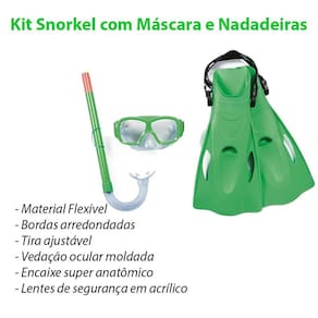 DADOS TÉCNICOS: Kit Snorkel com Máscara e Nadadeiras Material Flexível Bordas arredondadas Tira ajustável Vedação ocular moldada Encaixe super anatômico Lentes de segurança em acrílico