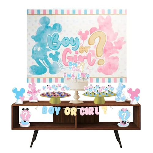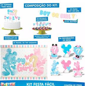 Kit Festa Pronta Chá Revelação Mickey e Minnie - A Magia da Descoberta em Minutos! Nosso kit "Só um Bolinho" é a forma mais fácil, e econômica de montar uma decoração completa e emocionante para anunciar se o seu bebê é menino ou menina. Esqueça a correria de procurar itens separados. Com este kit, você recebe 39 peças essenciais para criar uma mesa decorada profissional, do painel ao topo do bolo. É só montar e celebrar o momento mais esperado! // TRANSFORME QUALQUER ESPAÇO EM UMA FESTA MÁGICA! // Veja tudo o que você vai receber: • 01 PAINEL GIGANTE EM TNT (1,40m x 1,03m): O cenário para suas fotos! Com impressão de alta qualidade, ele transforma a parede e cria o clima da festa. • 01 FAIXA DECORATIVA "BOY OR GIRL?": O suspense no ar! Para pendurar na frente da mesa ou na parede. • 07 TOPOS DE BOLO: Para deixar seu bolo como o de uma confeitaria, com o tema da festa. • 24 PALITOS (TOPPERS) PARA DOCINHOS: Dê um toque nos brigadeiros e beijinhos, espalhando a decoração por toda a mesa. • 06 DECORAÇÕES DE MESA: Personagens em EVA de alta qualidade para dar vida e volume à sua decoração. // PRINCIPAIS BENEFÍCIOS DO SEU KIT FESTA FÁCIL // • ECONOMIA DE TEMPO: Não perca horas pesquisando. Em um único kit, você tem tudo o que precisa. • PRATICIDADE TOTAL: É a famosa festa na caixa! • QUALIDADE GARANTIDA: Com impressão de alta definição e materiais duráveis. // ESPECIFICAÇÕES // • Tema: Chá Revelação Mickey e Minnie (Boy or Girl?) • Quantidade Total de Itens: 39 Peças • Personalização: Não é possível fazer alterações ou personalizações. // PERGUNTAS FREQUENTES // 1. Preciso comprar algo mais para a decoração da mesa?