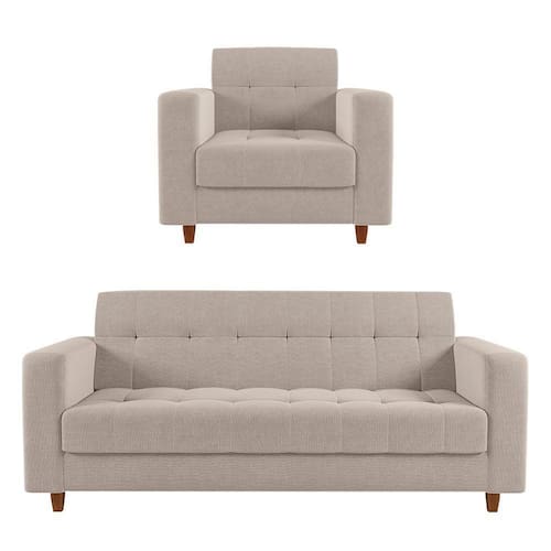 O Kit Sofá e Poltrona Arezzo é o match perfeito para quem deseja ter um lar funcional e cheio de elegância! Este modelo possui cores diferentes, que combinam com todos os tipos de decoração, é a junção de conforto e design moderno, sendo uma ótima escolha para sua casa, recepção ou em qualquer outro ambiente. Possui preenchimento em espuma de excelente qualidade, densidade D-26 no assento e nos braços, no encosto fibra siliconada e revestimento em tecido Linho. Estrutura em madeira reflorestada e percintas elásticas, que garantem durabilidade e alta resistência à poltrona. Dimensões Sofá Altura total: 87 cm Largura total: 180 cm Profundidade total: 75 cm Altura do encosto: 46 cm Largura do assento: 150 cm Profundidade do assento: 50 cm Altura do chão ao assento: 45 cm Espessura do assento: 20 cm Tamanho dos pés: 10 cm Altura do chão ao braço: 64 cm Altura interna do braço: 19 cm Espessura do braço: 15 cm Peso: 36 kg Dimensões Poltrona Altura total: 87 cm Largura total: 75 cm Profundidade total: 75 cm Altura do encosto: 46 cm Largura do assento: 45 cm Profundidade do assento: 50 cm Altura do chão ao assento: 45 cm Espessura do assento: 35 cm Tamanho dos pés: 10 cm Altura do chão ao braço: 64 cm Altura interna do braço: 19 cm Espessura do braço: 15 cm Peso: 16 kg Especificações do Produto Estrutura: Madeira Eucalipto Espuma: D-26 Tecido: Linho Tipo de pés: Pés chanfrado 10 cm Peso Suportado: Até 120 Kg por assento Garantia: 90 dias contra defeito de fabricação Montagem: Os produto vão montados, apenas rosquear os pés Instruções de Limpeza: Utilizar um pano limpo e levemente úmido Você irá receber: 02 volume com 02 produto Observações Relevantes - Todos os produtos vão embalados com total segurança; - As cores dos produtos podem sofrer alterações dependendo do seu monitor; - Para futuras compras, não garantimos a mesma tonalidade de cor, pois existe variação a cada lote do fabricante do tecido; - As imagens são meramente ilustrativas, não acompanham objetos de decoração e eletros; - Confira as dimensões do produto no momento da compra e certifique-se de que passará normalmente por escadas, elevadores, portas e corredores; - Importante: Por se tratar de estofado as medidas podem ter uma pequena variação em até 3 cm; - Não nos responsabilizamos no ato da entrega por montagens, desmontagens, instalações de produtos; - Não nos responsabilizamos no ato da entrega por subir escadas, elevadores, nem utilização de guinchos ou equipamentos similares para acesso a pisos superiores em apartamentos; - A entrega do produto é realizada em todo território nacional, até onde as rodovias alcançam, entregas fluviais ou aéreas devem ser cotadas a parte; - Observando as orientações acima, evita-se futuros desagrados ou imprevistos com a entrega do produto. Havendo despesas adicionais, serão de responsabilidade do cliente;