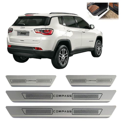 Kit soleira porta aço inox escovado jeep compass Soleira de porta em aço inox com acabamento em aço escovado. Proporciona uma área extra de preservação para a pintura de seu carro. Aumentando o cuidado contra riscos e arranhões, e ainda dando um estilo esportivo ao seu veículo.