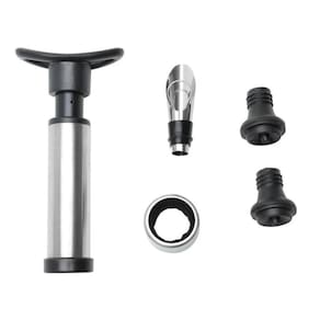 Ficha técnica: Material: Aço INox Peso: 0,300kg Dimensões: 5x16x24cm Conteúdo da Embalagem: 1 Bomba de extração a Vácuo 1 Bico Aerador para Servir 2 Rolhas de Vedação 1 Corta-Gotas para Garrafa