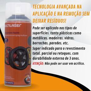 Com efeito de envelopamento preto fosco, este spray evita corrosões no objeto aplicado, assim como impede o acúmulo de sujeiras e não danifica o local. Além disso, esta tinta é bastante resistente à água, a sua aplicação é simples e a sua remoção é ainda mais fácil, podendo ser realizada com as próprias mãos.
