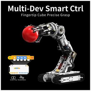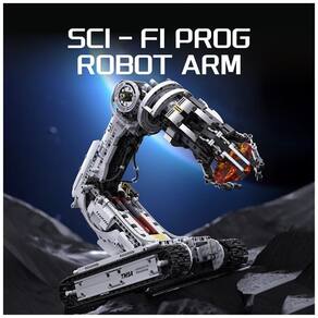 O kit Technical Tracked Robot Arm da UNCLE BRICK é um conjunto de blocos de montar com 1468 peças que permite construir um braço robótico motorizado sobre esteiras, com funções completas de locomoção e preensão. O modelo utiliza uma base tipo tanque com esteiras para movimentação para frente, para trás, giros em U e rotações laterais, além de um braço articulado que gira até 90 graus e uma garra que abre e fecha mais de 180 graus. O sistema é alimentado por caixa de bateria de íons de lítio e controlado por quatro motores M, com operação via controle remoto e também por aplicativo, tornando o modelo adequado tanto para exibição quanto para uso diário em brincadeiras de controle.
