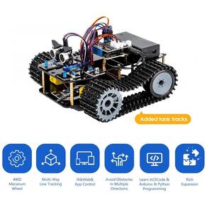 O ACEBOTT Smart Tank Robot Car Kit é um kit educativo de robótica baseado em controlador ESP32, que combina chassi tipo tanque com esteiras, rodas mecanum omnidirecionais, servos com engrenagens metálicas e sensores ultrassônicos e infravermelhos para formar um robô móvel totalmente programável. O sistema é compatível com Arduino, permite programação gráfica e inclui funções como cruzeiro com múltiplas rotas, desvio multidirecional de obstáculos e modo de seguir o usuário, com controle por aplicativo e controle remoto infravermelho para exploração prática de conceitos de navegação autônoma. O chassi em acrílico é projetado para alta resistência mecânica e o conjunto de esteiras largas garante melhor aderência e estabilidade em terrenos como grama, areia e superfícies irregulares, reduzindo ruído de locomoção.