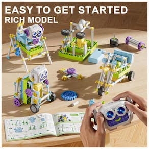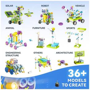 O SMILESSKIDDO 36-in-1 Robotics Kit (modelo 8013E) é um conjunto de construção STEM com 434 peças que permite montar mais de 36 modelos experimentais diferentes, indicado para crianças em torno de 8 a 13 anos. Os modelos exploram conceitos como geração de energia solar, engrenagens, sensores, atrito, excentricidade e efeitos visuais, incentivando a aplicação de princípios científicos em estruturas funcionais (veículos, mecanismos com engrenagens, dispositivos movidos a energia solar, etc.).