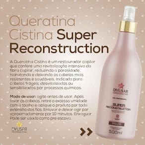 O Kit Contém: 1 Máscara Super Reconstrução 1Kg 1 Queratina 500Ml MASCARA SUPER RECONSTRUÇÃO 1KG Uma máscara capilar que tem efeito teia, promove hidratação profunda, nutrição intensa, maleabilidade, brilho e sedosidade. Modo de Usar: Apos lavar os cabelos, aplique o produto sobre toda a extensão dos fios. Massageie e deixe agir por aproximadamente 7 minutos. QUERATINA CISTINA 500ML É um restaurador capilar que confere uma revitalização intensiva da fibra capilar, reduzindo a porosidade hidratando e deixando os cabelos mais resistentes e saudáveis, indicada para cabelos frágeis, desvitalizados ou sensibilizados por processos químicos. Modo de usar: Agite antes de usar. Após lavar os cabelos, retire o excesso umidade com a toalha e aplique o produto por toda extensão dos fios. Enluvar e deixar agir por aproximadamente por 10 minutos. Enxaguar. Pode ser como pre escova. Marca: Não Informado
