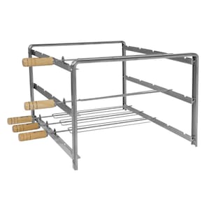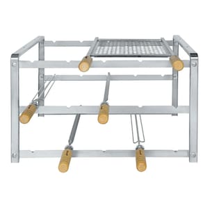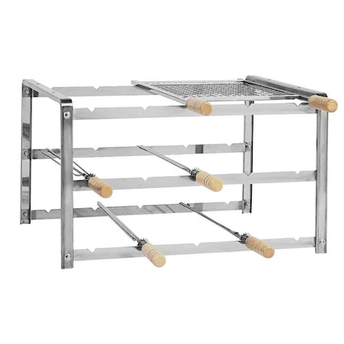 São suportes em AÇO INOXIDÁVEL para churrasqueiras de alvenaria, com 3 níveis de altura, para girar e fixar Espetos e Grelhas GIRAGRILL. Algumas características exclusivas ajudam a melhorar tecnicamente o churrasco: