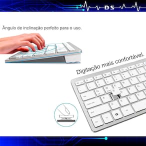 O Teclado Modelo Slim, pequeno, leve, resistente e ergonômico. Ideal para quem quer trabalhar com mais conforto, menos barulho de digitação, sem tirar nada do lugar, podendo usar à distância de até 10 metros, via Bluetooth.