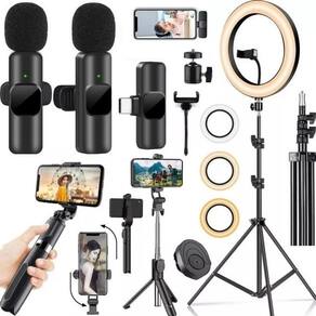 Kit suporte smartphone tripé iluminador profissional + microfone sem fio duplo gravar vídeo no celular selfie entrevista Kit completo profissional para gravação de vídeos Ring light led 10 polegadas 3 cores e 10 níveis de intensidade + tripé com ajuste de altura até 2,10 metros Rotação 360 graus que permite gravações na vertical e horizontal Microfone de lapela 2 em 1, duplo, sem fio de alta qualidade, sistema plug and play, fácil instalação e qualidade profissional Itens inclusos: 1x ring light 26cm led usb 1x adaptador ball head 360o 1x suporte flexível para celular 1x tripé e estabilizador 1x controle remoto bluetooth 1x tripé de 2,10 metros 2x microfones de lapela sem fio 1x lightning usb tipo-c Ring light led 26cm Desenvolvido para maquiadores, fotógrafos, youtubers, blogueiras que buscam uma ótima maneira de iluminar com perfeição. Controle de temperatura da luz; ajuste de ângulo com suporte articulado Diâmetro: 26 cm 10 pol 120 leds; 3 modos de iluminação Potência 20w max 1000lm Temperatura da cor: 3200 - 5600 Alimentação: 5v usb O cabo usb deverá estar conectado para funcionar Tripé com altura ajustável até 2.10 metros. Leve e compacto quando fechado pode ser guardado e transportado facilmente. Possui 3 seções e 3 travas, que proporcionam ao usuário uma regulagem na altura, de forma que possibilite criar diversos modos de uso. Microfone lapela duplo sem fio usb tipo-c Microfone sem fio duplo, 2 em 1, de alta qualidade, tipo-c para smartphones android entre outros com entrada de microfone tipo-c. Sistema plug and play, fácil instalação e qualidade profissional. Omni-direcional Voz clara e ótima captação Captação 360 graus Longo alcance 20-30 metros Sistema plug-and-play Bateria com até 5h de duração Espuma protetora Clipe para prender na roupa Características do 3 em 1 , tripé e estabilizador de celular. Faça vídeos na horizontal paisagem ou na vertical retrato com ajuste de inclinação. Controle incorporado ao e que também pode ser removido, para usar a distância Material: aço inoxidável Abertura do encaixe do telefone: 87mm Peso: 135g Tamanho fechado: 18cm Tamanho estendido: 70cm Controle remoto bluetooth Utiliza bateria cr1632 já incluída Importante: Imagens ilustrativas Seu pedido será postado em até 24 horas úteis após confirmação de pagamento Marca: Não Informado