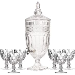 Para servir sucos ou águas aromatizadas em um evento especial, o Dispensador de Bebidas Casamiga é a melhor opção Com seu design em linhas clássicas e a transparência que exibe a beleza dos produtos em seu interior, se torna também um belo artigo de decoração. Utilize frutas frescas no seu preparo e desfrute de uma bebida deliciosa, refrescante e linda de se ver. E para quem ama decoração e quer um toque especial ao seu cantinho, essa é uma ótima ideia para dar elegância e requinte a sua mesa. Feita para servir e/ou decorar, a famosa taça Diamante foi projetada especialmente para você. Ficha técnica: Produto 1: Suqueira Cristal com Torneira 4,5L Class Home - Altura: 52 cm - Largura: 19 cm - Comprimento: 19 cm - Capacidade: 4,5 litros Produto 2: 6 Taças Água Diamante Clear Casamiga - Altura: 17 cm - Diâmetro: 9 cm - Capacidade: 260 ml Itens incluso: 1 Suqueira Cristal 4,5l + 6 Taças Água Diamante. Total 7 peças Embalagem: - Altura: 46 cm - Largura: 24 cm - Comprimento: 50 cm - Peso: 8,249kg. - Material: Colmeia/papelão Cuidados: Para limpeza utilizar detergente neutro e uma esponja macia; Medidas aproximadas. Imagens meramente ilustrativas.
