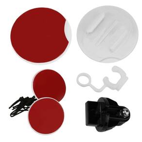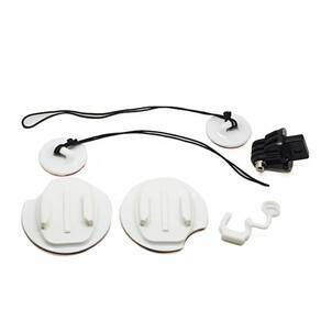 O conjunto inclui dois suportes com adesivos de alta fixação, com base de encaixe rápido para montagem da câmera; dois suportes com adesivos para prender o cordão de segurança; dois cordões/alças de amarração para prender a câmera; um conector de bloqueio em silicone para reduzir vibrações; e um plugue macho compatível com FCS e encaixe 3 pinos padrão camera esportiva.