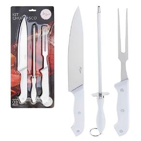 Kit Tábua Corte Bambu + Faca Garfo Chaira Afiador Churrasco