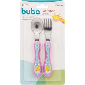 Kit Talher Animal Fun Girafinha Buba Kit com garfo e talher em aço inoxidável com design anatômico e estampa de girafinha. O formato anatômico facilita o manuseio pelos pequenos. As pontas arredondadas dos talheres tornam a refeição mais segura e confortável. O aço inoxidável é mais resistente e fácil de limpar. Conteúdo da embalagem: 1 garfo + 1 colher estampa girafinha. Medidas: garfo: 14 x 2 x 1 AxLxP cm; Colher: 14 x 3 x 1 AxLxP cm Blister: 20 x 10 x 1,5 AxLxP cm Composição: Aço inoxidável e Polipropileno. Possui certificação pelo INMETRO. Recomendado para crianças com +6 meses. Garantia de 90 dias contra defeitos de fabricação.