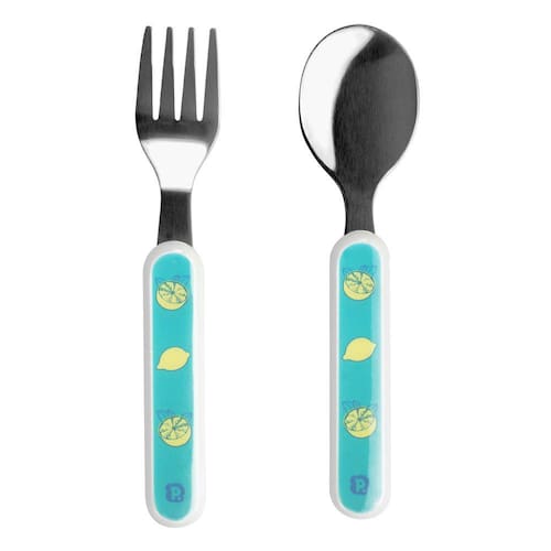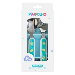Kit talher Limão Verde Pimpolho ideal para incentivar a criança à ter autonomia na hora das refeições, possui garfo e colher produzidos com lâminas de aço inox e cabos de polipropileno, com tamanho ideal para as mãozinhas do bebê.