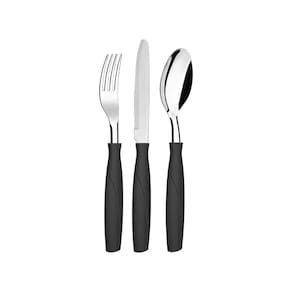 O Kit contém uma necessária com dimensões de 15x21x6 cm (CxLxA), fabricada em polipropileno na cor Fumê, e um garfo, uma faca e uma colher de mesa em aço inox, com os cabos em polipropileno na cor Preta. Fáceis de limpar, são os parceiros ideais na administração de uma vida corrida, cabendo na bolsa ou mochila.