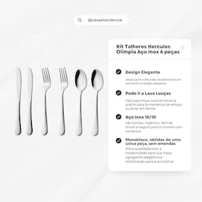 Kit Talheres de Sobremesa Hercules Olimpia Aço inox 6 peças Descrição: O Kit de Talheres de Sobremesa com Colher, Faca e Garfo da nossa linha premium é perfeito para quem busca unir funcionalidade e estilo. Produzido em aço inox de alta qualidade, cada peça foi cuidadosamente elaborada para proporcionar máxima durabilidade e resistência. Com um acabamento impecável e design moderno, os talheres oferecem conforto e ergonomia, tornando cada refeição um momento ainda mais especial. A faca possui lâmina afiada, ideal para cortes precisos, enquanto o garfo e a colher apresentam detalhes suaves e polimento brilhante que trazem um toque de requinte para qualquer mesa. Seja para um jantar casual ou uma ocasião especial, esse conjunto é a escolha perfeita para quem valoriza sofisticação. Venha transformar suas refeições com este kit exclusivo que combina tradição e inovação em cada detalhe. Características: - Aço inoxidável; - Aço Inox 18/10; - Acabamento Premium com alto Brilho; - Ergonômico; - Lamina Forjada e Temperada; - Polimento entre os dentes; - Ponta Arredondada; - Monobloco, obtidas de uma única peça, sem emendas; - Design Exclusivo e Sofisticado; - Pode ir a Lava Louças; Composição do Kit: - 2 Faca de Sobremesa Ponta arredondada : 21 cm; tamanho lâmina 10cm e espessura 2,5 mm - 2 Garfos de Sobremesa: 18,5 cm e espessura 2,5 mm - 2 Colheres de Sobremesa: 18,5cm e espessura 2,5 mm Especificações: Marca: Hércules; : 3 meses; ---- Aqui na Casa & Tendência você encontra os melhores utensílios domésticos e tudo que você precisa para sua cozinha ---- Marca: Não Informado