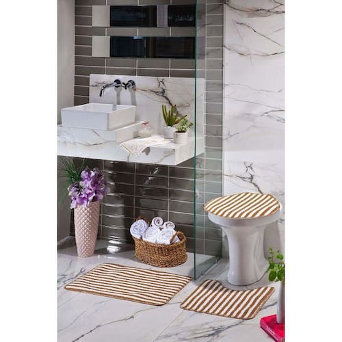 Kit Tapete Banheiro 3 Peças Listras Caramelo Slim * COMPOSIÇÃO: 100% POLIPROPILENO * MEDIDAS 01 Tapete para Piso 40cm x 60cm 01 Tapete para Vaso 39cm x 40cm 01 Tapete para Tampa 40cm x 46cm * MODELO PRATIK KIT BANHEIRO COM APLICAÇÃO DE E.V.A. *COR CARAMELO *BASE 100% POLIPROPILENO ANTIDERRAPANTE