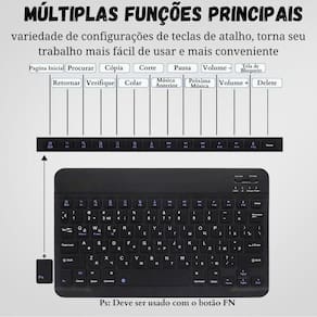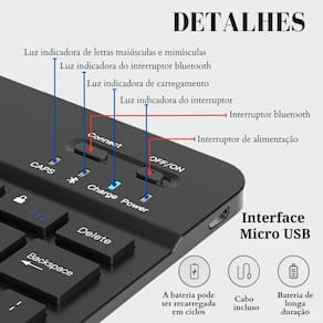 Especificações: - Altura: 15cm - Largura: 24,5cm - Conector teclado: micro USB - Conector mouse: 2 pilhas AAA não inclusas - Configuração: ABNT 1 - Distância de trabalho: até 10 metros - Conexão: via Bluetooth - Economia de bateria: após 10 minutos de inatividade - Peso: 190g