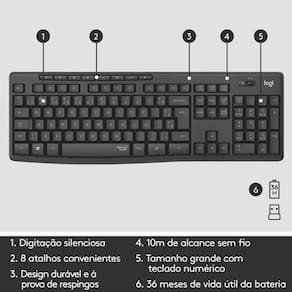 Kit Teclado E Mouse Sem Fio Logitech Silent Mk295 Combo Teclado e Mouse sem fio Logitech MK295 Mantenha o foco e faça mais com o Logitech MK295 Silent - um combo de teclado e mouse projetado para eliminar o excesso de ruído para você e as pessoas ao seu redor. Bem-vindo a uma nova experiência de teclado e mouse virtualmente sem ruído. O combo usa a nova tecnologia SilentTouch para remover 90% dos sons das teclas e cliques enquanto mantém a sensação familiar de digitação e clique. Chega de interrupções e atrasos graças a uma conexão sem fio confiável de 2,4 GHz com alcance de até 10 metros de distância. Deixa sua mesa livre dos fios com um receptor USB - tão pequeno que pode ficar no seu computador. O teclado possui padrão brasileiro ABNT2, além de um design resistente a derramamentos, teclas duráveis e apoios resistentes para ajuste de altura que adicionam uma camada extra de utilidade e conforto. Características: - Marca: Logitech - Modelo: 920-009793 Especificações: - Tecnologia SilentTouch para digitação e cliques silenciosos com 90%* menos ruído. - Teclado com padrão brasileiro ABNT2 e conexão sem fio de 2,4 GHz. - Teclado numérico completo, 8 botões de atalho e botões dedicados para reproduzir/pausar, volume, mudo e até mesmo seu e-mail. - Design à prova de derramamento***, teclas duráveis. - Compatível com Windows e Chrome OS Requisitos do sistema: - Windows 10, 11 ou superior - Chrome OS Conteúdo da embalagem: - Teclado - Mouse Ean: 097855161062