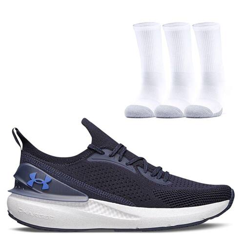 Tênis de Corrida Under Armour Charged Quicker e Confeccionado em gáspea retilínea bicolor com elastano, apresentando uma estrutura anatômica similar à de uma meia, se adaptando ao pé e facilitando o calce.Meia Unissex Under Armour Heatgear Crew - Pacote com 3 pares, modelo com tecnologia anti-odor impede o crescimento de micróbios causadores de odor. 97% Poliéster e 3% Elastano. Composição: 67% Algodão, 30% Poliéster e 3% Elastano. Tamanho:G = 41-44.