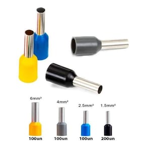 200un - Terminal Ilhós Simples Tubo 1,5mm x 8mm - Preto 100un - Terminal Ilhós Simples Tubo 2,5mm x 10mm - Azul 100un - Terminal Ilhós Simples Tubo 4,0mm x 12mm - Cinza 100un - Terminal Ilhós Simples Tubo 6,0mm x 12mm - Amarelo