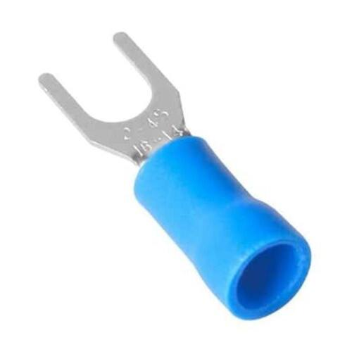 O kit de terminais forquilha 2,50 mm com fenda de 5 mm, na cor azul, oferece conexões elétricas confiáveis e resistentes, ideal para aplicações profissionais, com embalagem prática de 100 peças.