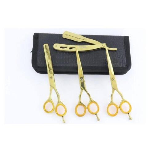DESCRIÇÃO: Kit com 3 tesouras e 1 navalhete profissional tamanho 6.0 polegadas em aço 420C Kit perfeito para quem deseja trabalhar com produto 100% novo e de alta qualidade Ferramentas ideias para cabeleireiros e barbeiros Tesouras com acabamento mais leves e resistentes Suas composições preservam o funcionamento e afiação das tesouras por mais tempo As navalhas são indicadas para barbear dar acabamento ou finalizar cortes