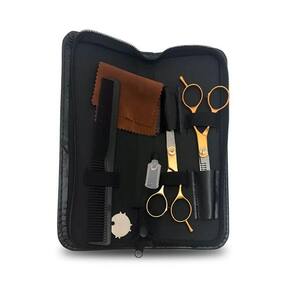 Ideal para uso doméstico kit completo com os materiais necessários para cortes femininos e masculinos. Possui tesoura com dentes para corte repicados e finalizações de cortes. Material inoxidável e plásticos ABS resistente. Estojo compacto que pode ser levado em viagens e transportar sem danificar os itens.